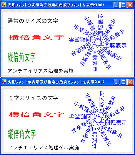 | 変形フォントの表示及び指定の角度でフォントを表示 (4) (SNo.108) 1.横倍角文字表示 2.縦倍角文字を表示 3.指定の角度でフォントを表示 4.アンチエイリアス処理をしたフォントを表示 |