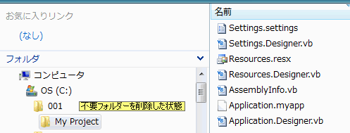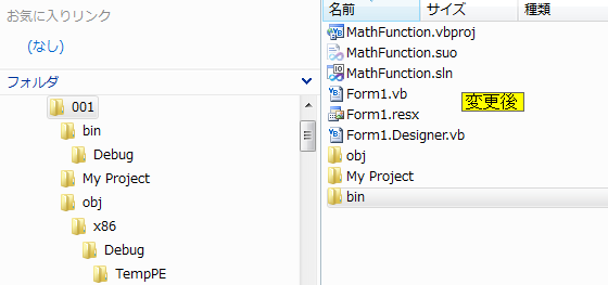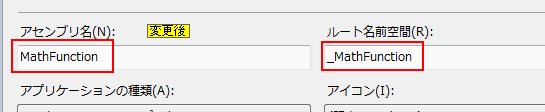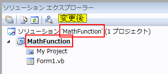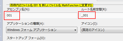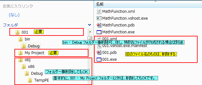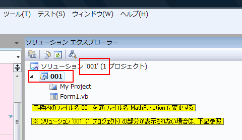 | ソリューション名及びプロジェクト名を変更する場合、次の手順通りに変更して下さい。 1.下記の001.vbproj 、001.suo 、001.sln のファイル名の 001 の部分を MathFunction に変更する場合を例にとって説明します。 私の場合は、ソリューションのディレクトリを作成のチェックを外した状態で作成しておりますが、作成されていても同様の操作で変更できます。 ![]() 2.まず、001.sln ファイルをダブルクリックしてIDE上に表示して下さい。 ファイル名を変更する前に、ソリューションのクリーンビルドを実施しておいて下さい。 (旧名の不要ファイルが削除されます。) ![]() 上記で、削除されるファイルは、[デバッグ開始]を実行すると新たに作成されるファイルです。 クリーンビルドを忘れた場合や旧名のファイルが残っている場合は、7.以降の要領で削除して下さい。 その後、3.に進む ![]() 3.上記のようにソリューションエクスプローラーを表示し、赤枠内の 001 のファイル名を新ファイル名(MathFunction)に変更して下さい。 ※ ソリューション名が表示されない場合は、別途、下記にて表示する方法を説明します。 4.次に、メニューのプロジェクト→001 のプロパティ をクリックして、アプリケーションのタブを開いて下さい。 ![]() 5.上記のような画面が表示されたら、赤枠内の 001 を同様に新ファイル名に変更して下さい。 6.変更した結果の図を下記に表示します。 ![]() ![]() 7.上記のように、4ヶ所のファイル名を変更したらファイルを保存して終了して下さい。 エクスプローラーで、見てみると下記のように変更されているはずです。 ![]() ![]() 8.プログラムをIDE上に起動する事によって作成されるファイル等は、旧のファイルのまま残っていますので、削除して下さい。(変更前にクリーンビルドを実施しておけば、残っていないはずですが。) 通常は、001 フォルダーとMy Project フォルダーを除いたフォルダー事削除しても OK です。 但し、Debug フォルダー内等に、ご自分が持ってきたファイル等がある場合は削除しないで下さい。 9.不要フォルダーを削除した状態(必ずとも必要ではありませんので状況に応じて実施して下さい。) ![]() 10.これで、IDEを起動して、デバッグ開始又は、ビルドすると削除したフォルダーとファイルが作成されますし、エラーも発生せず、実行できれば、完了です。 |