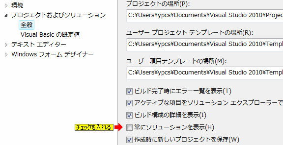 | ※ ソリューション名が表示されない場合は、下記をチェックして下さい。 1.IDE画面上で、メニューのツール→オプション→プロジェクト及びソリューションの全般を開いて下さい。 ![]() 2.上記の常にソリューションを表示にチェックを入れて元の画面を見て下さい。 ソリューション名が表示されているはずです。 |