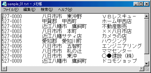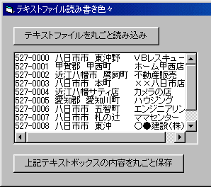 | 読込んだデータをテキストボックスやリストボックスに表示する場合ここのStrCut()関数等を使ってText1.Text = Text1.Text & StrCut(strYubin(lngCount), 14)