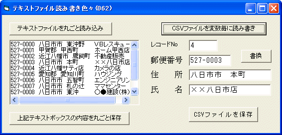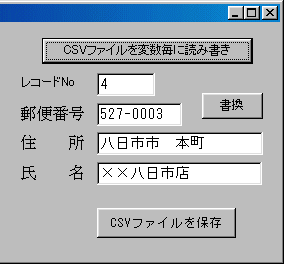 | 2.テキストファイル(CSV形式)を変数毎に読み書きする Private Sub Command3_Click() 'CSV形式ファイルを変数毎に読み書きする lngDatN = 0 '使用可能なファイルナンバーを取得 intFileNo = FreeFile 'シーケンシャル入力モードで sample.csv をオープン Open "sample.csv" For Input As #intFileNo 'EOF(intFileNo)が True になるまで実行 Do Until EOF(intFileNo) lngDatN = lngDatN + 1 '件数をカウント '変数を1個づつ追加宣言 ReDim Preserve strYubin(lngDatN) As String ReDim Preserve strAddre(lngDatN) As String ReDim Preserve strNamae(lngDatN) As String 'データを各変数に読込 Input #intFileNo, strYubin(lngDatN), strAddre(lngDatN), _ strNamae(lngDatN) Loop 'ファイルを閉じる Close #intFileNo '4番目のデータを表示 Text2.Text = 4 Text3.Text = strYubin(4) Text4.Text = strAddre(4) Text5.Text = strNamae(4) End Sub 表示結果 ![]() Private Sub Command4_Click() 'CSV 形式で保存 Dim lngCount As Long intFileNo = FreeFile 'シーケンシャル書込みモードで sample.csv をオープン Open "sample_01.csv" For Output As #intFileNo For lngCount = 1 To lngDatN Write #intFileNo, strYubin(lngCount), _ strAddre(lngCount), strNamae(lngCount) Next lngCount Close #intFileNo End Sub 保存結果 Excelでそのまま読み込めます ![]() レコードの表示切替 Private Sub Text2_KeyPress(KeyAscii As Integer) '配列の内容をテキストボックスに表示 Dim Rcno As Long If KeyAscii = vbKeyReturn Then KeyAscii = 0 If Len(Text2.Text) > 0 Then Rcno = CLng(Text2.Text) Text3.Text = strYubin(Rcno) Text4.Text = strAddre(Rcno) Text5.Text = strNamae(Rcno) End If End If End Sub データを変更した場合書換 Private Sub Command5_Click() '変更したデータを配列に読み込み Dim Rcno As Long If Len(Text2.Text) > 0 Then Rcno = CLng(Text2.Text) strYubin(Rcno) = Text3.Text strAddre(Rcno) = Text4.Text strNamae(Rcno) = Text5.Text End If End Sub 全 体 図 ![]() |